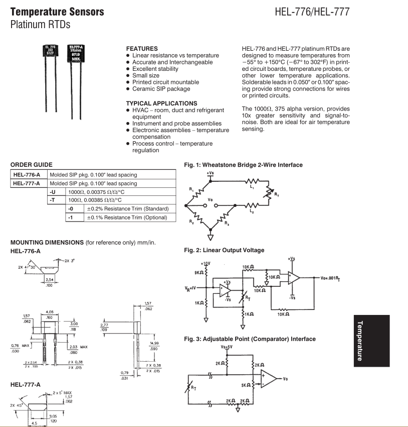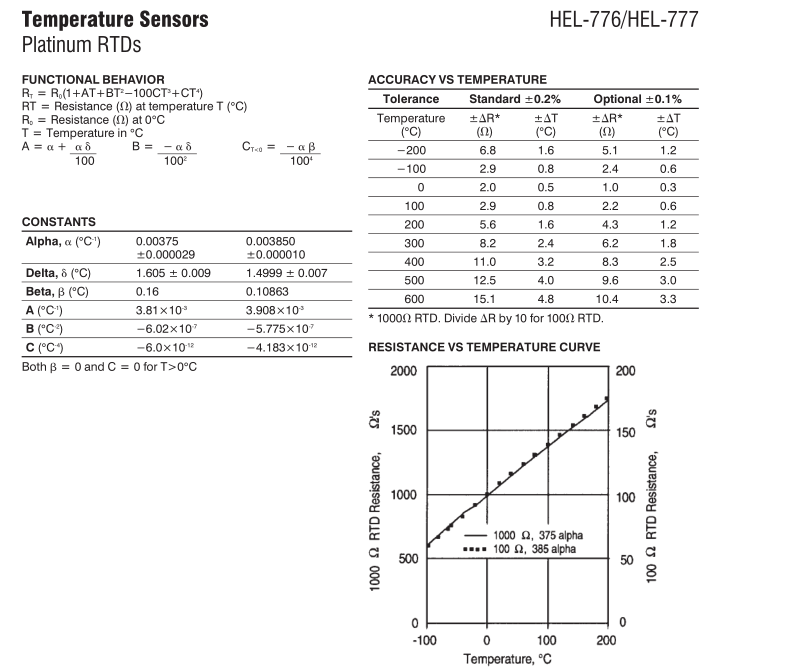 Sensor Type Thin film platinum RTD: R0 J 1000 V @ 0°C; alpha J 0.00375 V/V/°C